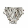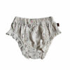 Deze mooie gebroken witte bloomer – broekje – komt uit de Spring Lucky collectie van Frogs and Dogs. De bloomer is ook gemaakt van gekreukte stof en heeft op een overall print van bloemetjes. Aan de bovenkant zit een elastische rand met het logo en de pijpjes hebben aan de binnenzijde elastiek genaaid. De bloomer is een korte broek die je als ‘onderbroekje’ aantrekt over een luier. Als je kleintje een jurkje of rokje aan heeft dan zie je de luier niet. Voordeel is dat ze dan zelf de luier niet kunnen lostrekken.