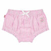 Deze mooie roze/wit gestreepte bloomer komt uit de Spring Breeze collectie van Frogs and Dogs. De bloomer is gemaakt van roze/wit gestreepte stof. Aan de bovenkant zit een elastische rand met een sierstrikje met op de voorzijde het logo van de lijn genaaid. De pijpjes hebben aan de binnenzijde elastiek genaaid. De bloomer is een korte broek die je als ‘onderbroekje’ aantrekt over een luier. Als je kleintje een jurkje of rokje aan heeft dan zie je de luier niet. Voordeel is dat ze dan zelf de luier niet kunnen lostrekken.