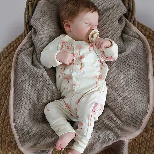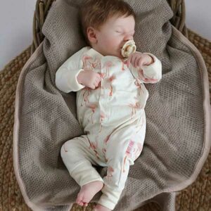 Gemaakt van 95% katoen en 5% elastaan, voelt het pakje aangenaam zacht aan en beweegt het mee met elke beweging. De stof is bovendien gecertificeerd met het Oeko-Tex Standard 100 keurmerk, wat betekent dat het veilig is voor de gevoelige babyhuid én duurzaam geproduceerd is.