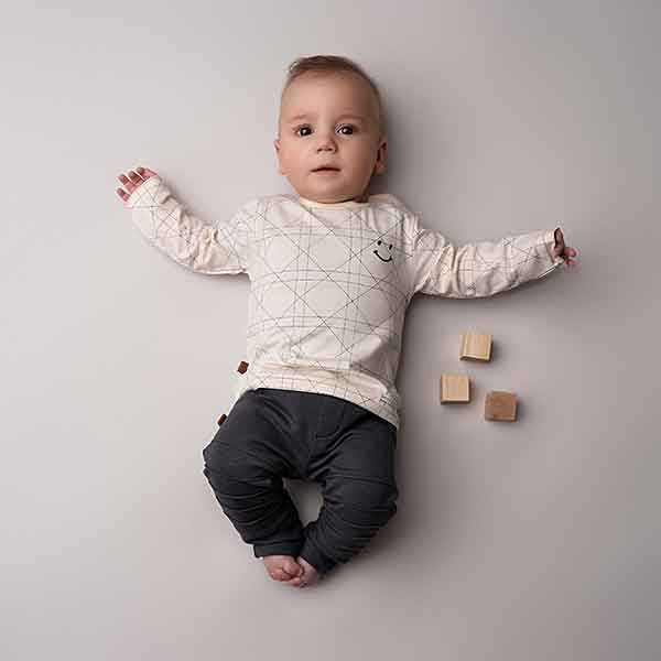 Het effen antracietgrijze broekje is gemaakt van een zachte, ademende stof die fijn aanvoelt op de huid. De bikerstripes zitten alleen aan de voorzijde van de pijpjes en zijn zo verwerkt dat je kindje er aan de binnenkant niets van voelt. Dankzij de elastische tailleband met koord blijft het broekje goed zitten en kan je kleintje vrij bewegen, kruipen en spelen zonder beperkingen.