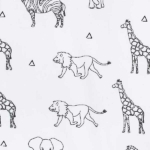 Een leuk wit broekje met een dierenprint in het zwart uit de collectie Safari van Jollein. De dierenprint bestaat uit olifanten, giraffes, leeuwen en zebra’s. Het broekje heeft een elastische band met koordje.  Het broekje is gemaakt van 95% biologisch katoen en 5% elastaan.