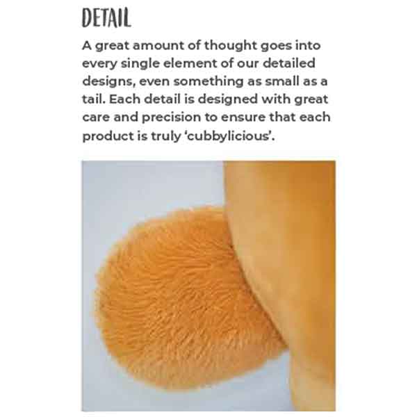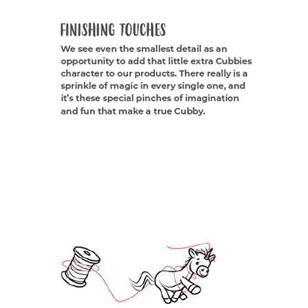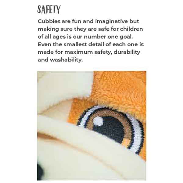 Cubbies Jasmine is met zorg ontworpen om zowel kinderen als ouders blij te maken. De zachte materialen voelen prettig aan op de huid en zijn geschikt voor baby’s en peuters. Dankzij de handige ritssluiting aan de onderzijde kan de vulling eenvoudig worden verwijderd, zodat de knuffel veilig in de wasmachine kan zonder zijn vorm te verliezen. Zo blijft Jasmine altijd fris, schoon en heerlijk zacht. Elk detail, van haar geborduurde snuit tot haar pluizige staart, is met de hand afgewerkt voor de kenmerkende kwaliteit van Cubbies.
