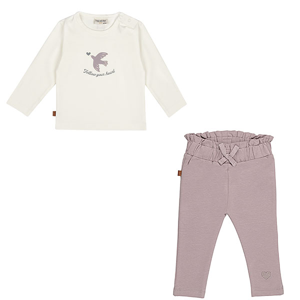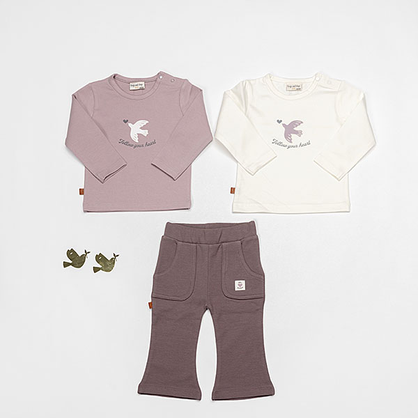 De vogelprint in lichtpaars met de tekst Follow Your Heart geeft het shirtje een dromerige uitstraling. De neutrale kleur Jet Stream laat zich eenvoudig combineren met de broekjes en vestjes uit dezelfde collectie. Zo creëer je met gemak een zachte, harmonieuze outfit die perfect past bij de stijl van Frogs and Dogs. Ideaal voor elk seizoen en geschikt voor zowel binnen als buiten.