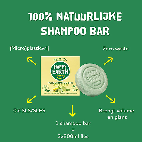 De Shampoo Bar Volume and Shine van Happy Earth bevat natuurlijke ingrediënten zoals sheaboter, jojobaolie en zonnebloemolie. Deze oliën helpen het haar soepel te houden en zorgen tegelijkertijd voor volume en glans. Sheaboter voedt en ondersteunt de haarvezel waardoor breekbaarheid afneemt. Jojobaolie geeft het haar een gladde structuur en maakt het makkelijker doorkambaar. Zonnebloemolie is rijk aan vitamine E en biedt bescherming tegen invloeden van buitenaf. Dit maakt de shampoo bar ideaal voor haar dat snel futloos wordt of extra glans kan gebruiken.