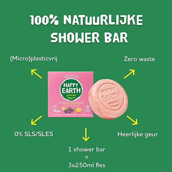De shower bar van Happy Earth verzorgt de huid op een milde manier zonder gebruik te maken van schadelijke toevoegingen. De natuurlijke oliën trekken snel in tijdens het douchen waardoor de huid niet droog aanvoelt. De bar schuimt rustig op waardoor deze prettig aanvoelt op de huid. Door de vaste vorm blijft het product langer houdbaar en gaat het minder snel op dan vloeibare douchegel. De bar is volledig plasticvrij en vormt een bewuste keuze voor iedereen die duurzamer wil douchen. Door te kiezen voor een shower bar verminder je afval en kies je voor een huidvriendelijke formule die past bij een natuurlijke verzorgingsroutine.