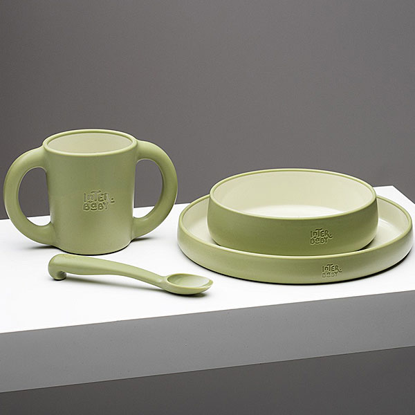 Interbaby siliconen servies Olive Green 4-delig – groen bord, ontbijtbord, beker & lepel