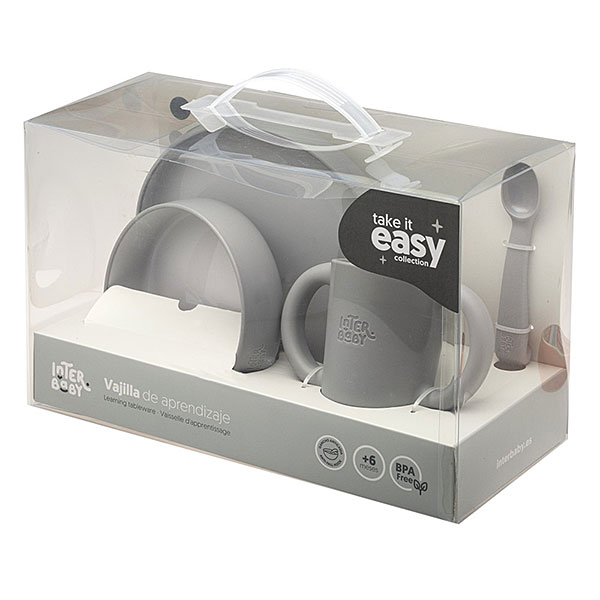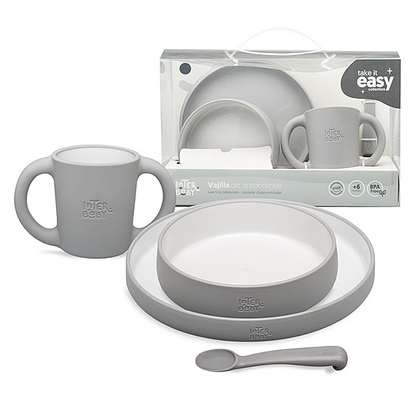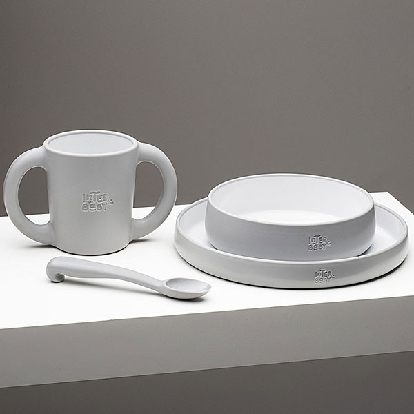 Interbaby siliconen servies Petrol Gray 4-delig – grijs bord, ontbijtbord, beker & lepel