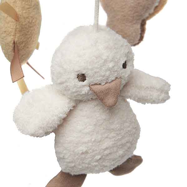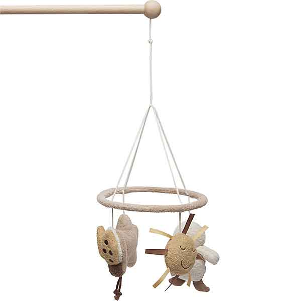 De Jollein babymobiel is ontworpen om baby’s te stimuleren zonder te veel prikkels te geven. De diertjes zijn gemaakt van 100% polyester teddy en voelen zacht aan wanneer je kindje de handjes uitstrekt om te grijpen. In elk figuurtje zit een veilige polyester vulling zodat ze licht en soepel bewegen wanneer ze zachtjes worden aangetikt of door de luchtstroom mee deinen. De knuffeltjes zijn ongeveer 12 cm groot, precies goed om op te vallen zonder te overheersen. De subtiele vormen van het zonnetje, het eendje en het lieveheersbeestje zijn vriendelijk en herkenbaar voor kleine kinderen, wat zorgt voor een vertrouwd en rustig gevoel. Door de rustige kleuren, biscuit, ivory en zachte bruintinten, past deze mobiel bij vrijwel elke babykamerstijl. Het geheel is stevig bevestigd aan een zachte, ronde rand waardoor alles veilig blijft hangen. Deze mobiel moedigt kijken, volgen met de ogen en eerste grijppogingen aan, waardoor de zintuigen en motoriek op een natuurlijke manier gestimuleerd worden.