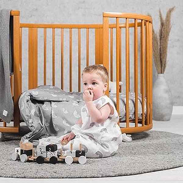 Het regenboogmotief geeft een speelse maar rustige uitstraling. De keuze uit roze en grijs maakt deze slaapzak geschikt voor verschillende stijlen in de babykamer. Dankzij het lichte materiaal is hij ook makkelijk mee te nemen op reis of bij een logeerpartij.