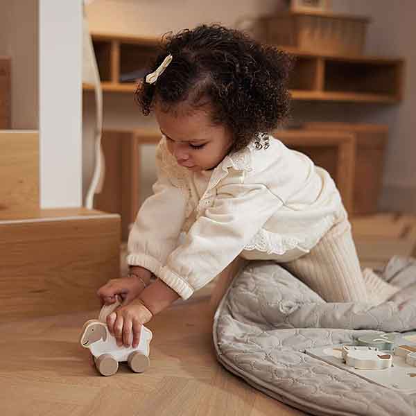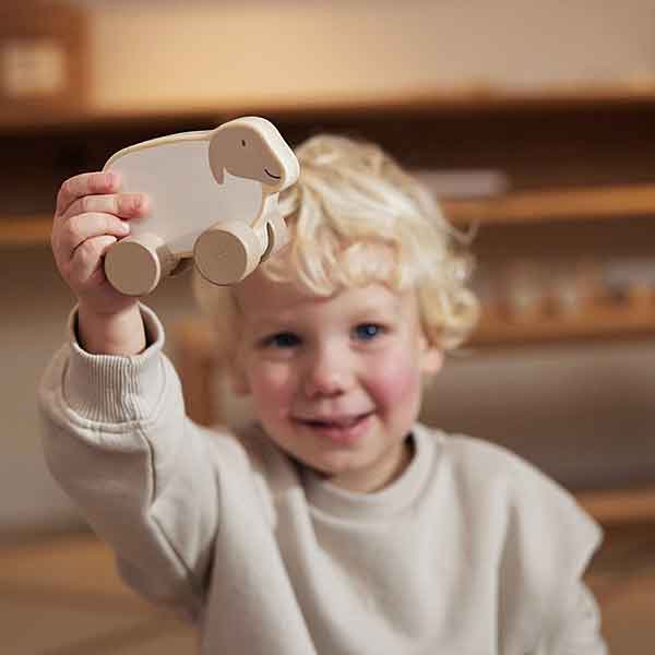 Deze houten speelgoedauto Farm Lamb is ontworpen om jonge kinderen op een veilige en speelse manier te laten ontdekken. Dankzij de afgeronde randen en het robuuste ontwerp kan het lammetje tegen een stootje en blijft het langdurig mooi, zelfs wanneer het intensief gebruikt wordt. Het gladde oppervlak voelt prettig aan en voorkomt dat kleine handjes zich bezeren, waardoor het speelgoed geschikt is voor dagelijks gebruik. De wieltjes bewegen soepel mee en stimuleren beweging, coördinatie en motoriek tijdens het spelen. Kinderen kunnen het lammetje vooruit duwen, meenemen in een speelgoedkist of gebruiken in hun rollenspellen waarin de fantasie de hoofdrol speelt.