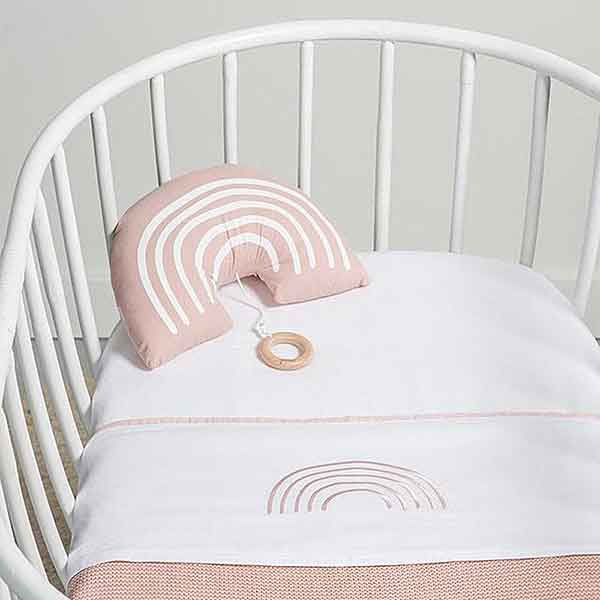 Dit wieglaken Rainbow pink van 75 x 100 cm zorgt voor een rustige en liefdevolle uitstraling in de wieg. Het subtiele regenboogje geeft een zachte speelse touch zonder druk te worden. De lichte kleuren passen perfect in iedere babykamer. Het laken voelt prettig aan op de gevoelige babyhuid. Ideaal voor dagelijks gebruik in de wieg of kinderwagen. Een fijne basis voor een harmonieuze babyuitzet.