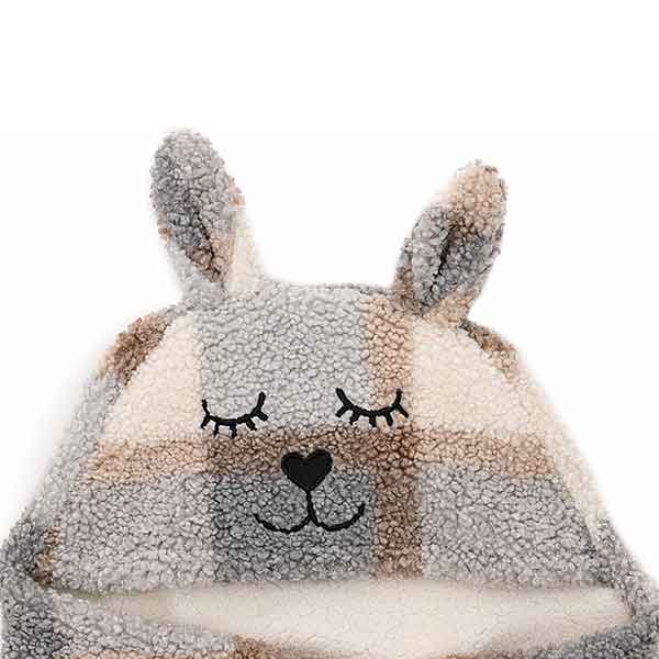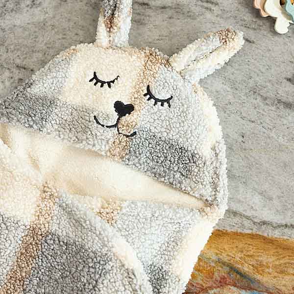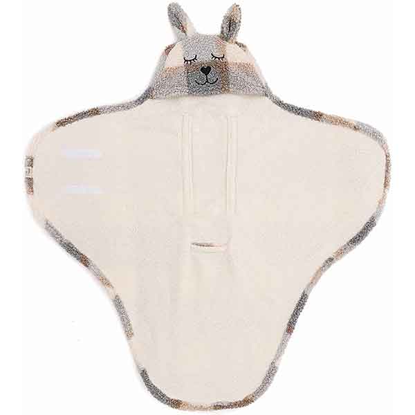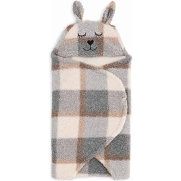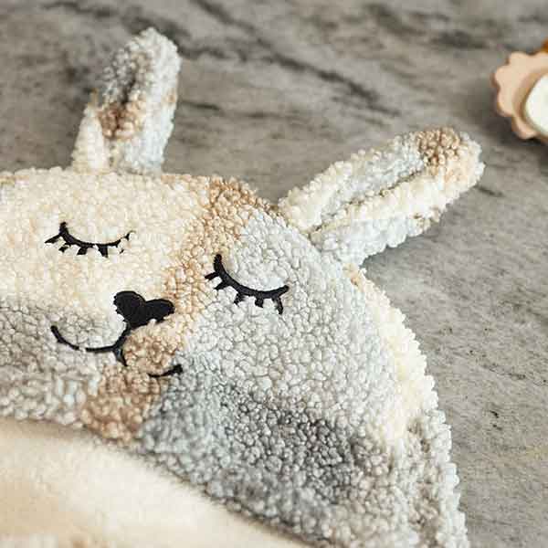 De wikkeldeken is voorzien van klittenbandstroken waarmee je de omslag eenvoudig sluit. De capuchon met schattige oortjes en een lief konijnengezichtje maakt het geheel compleet. Wikkel je baby erin na het badderen, tijdens het voeden of onderweg in de autostoel – deze deken zorgt altijd voor geborgenheid en warmte.