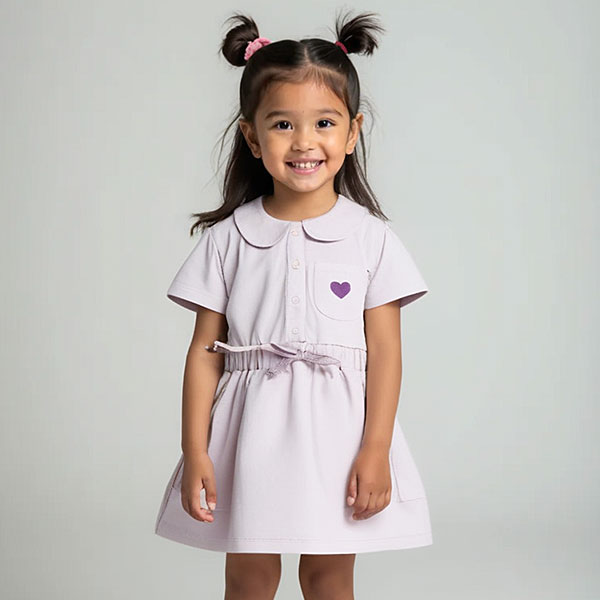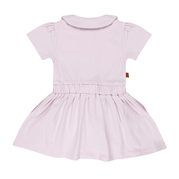 De lavendelkleurige tint en het geborduurde hartje op het borstzakje geven dit jurkje een schattige en herkenbare look. De licht gepofte mouwtjes en het gerimpelde rokje zorgen voor een speelse uitstraling, terwijl het strikje in de taille een elegant detail toevoegt. De twee steekzakjes maken het jurkje niet alleen schattig, maar ook functioneel. Combineer het met een haarbandje of vestje uit dezelfde collectie voor een complete en harmonieuze outfit.
