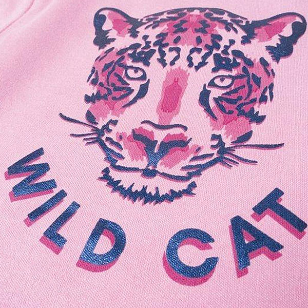 Deze pyjama heeft een stoere en vrolijke uitstraling dankzij de combinatie van roze tinten en een opvallende luipaardenprint. Het grote luipaardenhoofd op het shirt geeft direct karakter aan het geheel en valt extra op door de donkerblauwe details en de tekst Wild Cat. De broek met all over luipaardenprint maakt de set compleet en geeft een speelse en stoere touch. De roze boorden zorgen voor een mooie afwerking en dragen bij aan het draagcomfort. Deze pyjama is ideaal voor kleine dierenliefhebbers die houden van prints, kleur en een fijne zachte outfit voor de nacht en ochtend.